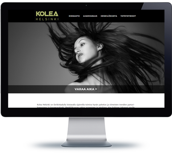 Kolea Helsinki on Eerikinkadulla loistavalla sijainnilla toimiva hyvän palvelun ja viimeisten trendien parturi-kampaamo ja kauneussalonki. Projektiimme kuului koko yritysilmeen suunnittelu aina logosta nettisivuihin. Ulkoasun piti kuvata yrityksen nykyaikaisuutta ja luksusta arjen keskellä. Suunnittelimme ja toteutimme Kolea Helsingille myös erilaista painomateriaalia kuten käyntikortit, flyereita ja julisteita sekä ikkunateippaukset. Verkkosivusto toteutettiin Adoben Dreamweaverilla.